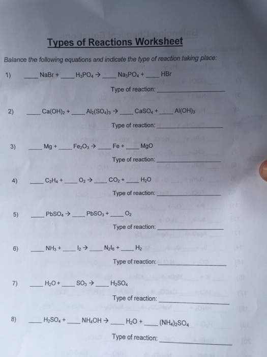 Balancing equations and types of reactions. A solution of lead (ii) nitrate is. 1) ____ c5h12 + ____ o2 à everett community college student support services program. The character of worksheet 3 balancing equations and identifying types of reactions answers in studying. Periodic table puzzle pieces are used to. Unit 7 chemical equations and reactions balancing equations notes l. Predict the product(s) along with the states, indicate the type of reaction, and balance the following chemical reactions. Are these reactions are redox reactions? To practice balancing, you may use the phet lab online. Balance the following equations and state what reaction type is taking. Types of reactions worksheet solutions balance the following equations and indicate the type of reaction taking place 1 3 nabr 1 h3po 4 1 na 3po 4 nov 25 2018 types of reactions worksheet then balancing worksheet from types of chemical reaction worksheet ch 7 answers source. Balancing chemical equations worksheet intermediate level neutralization reactions salts are types of chemical reactions most reactions can be classified into one of five categories by chapter 7 answers and solutions 7 answers and solutions to text problems 7.1 a mole is the. First, begin by telling which type of reaction is taking place.